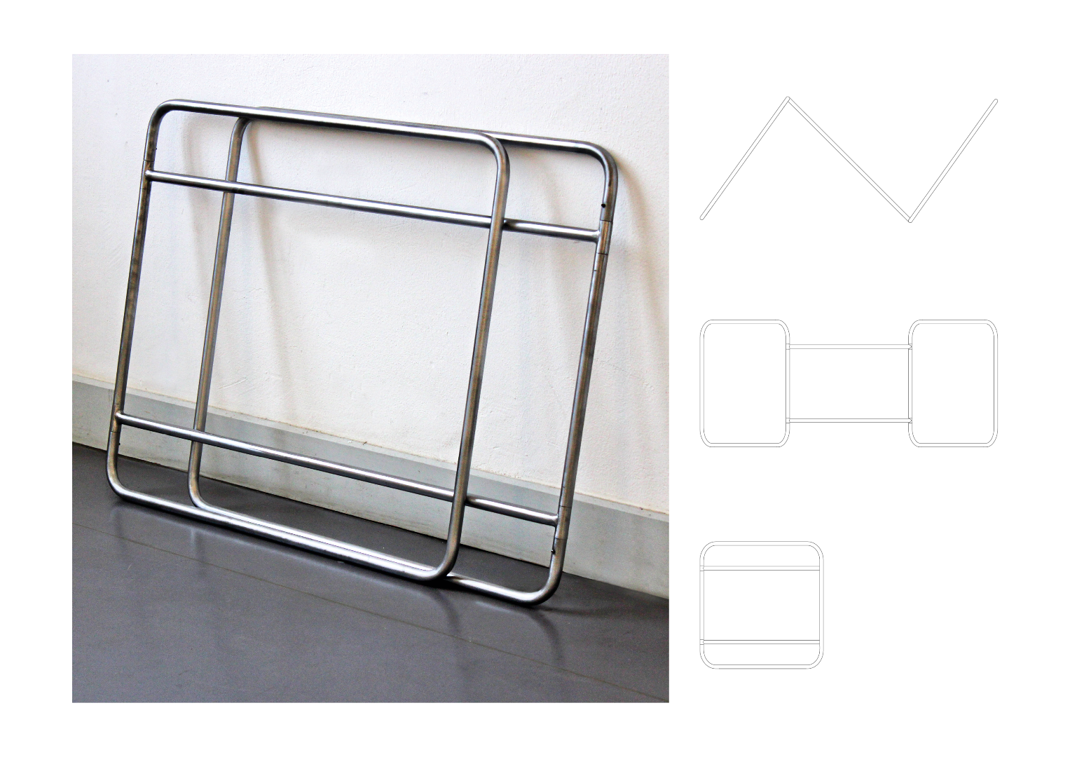 Die Verbindungselemente sind maschinell hergestellt. Sie sind am Mittelelement des Gestells mit einem Schweißpunkt verbunden. Die Drehbewegung des Tischgestells ermöglicht nicht nur eine flexible Form, sondern sorgt dafür, dass es sich auch bei Nichtnutzung leicht verstauen lässt.