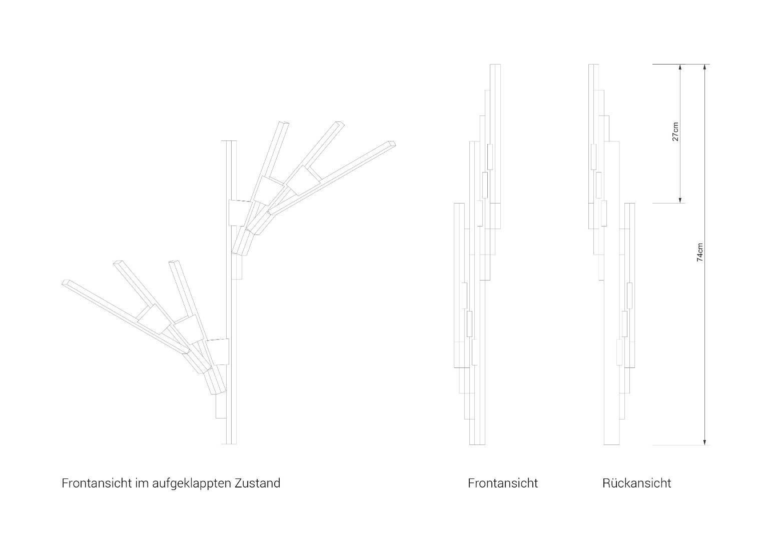 Die Keilform des Mittelelements lässt die Elemente seitlich wegklappen, sodass ein Abstand zur Wand entsteht. Der Abstand sorgt für die freie Beweglichkeit der Elemente. Zudem bietet die Keilform eine größere Befestigungsfläche zur Wand. Der erste Prototyp wurde für die Entwicklung des Regales aus MDF hergestellt. Das fertige Regal besteht aus massivem Kirschholz.